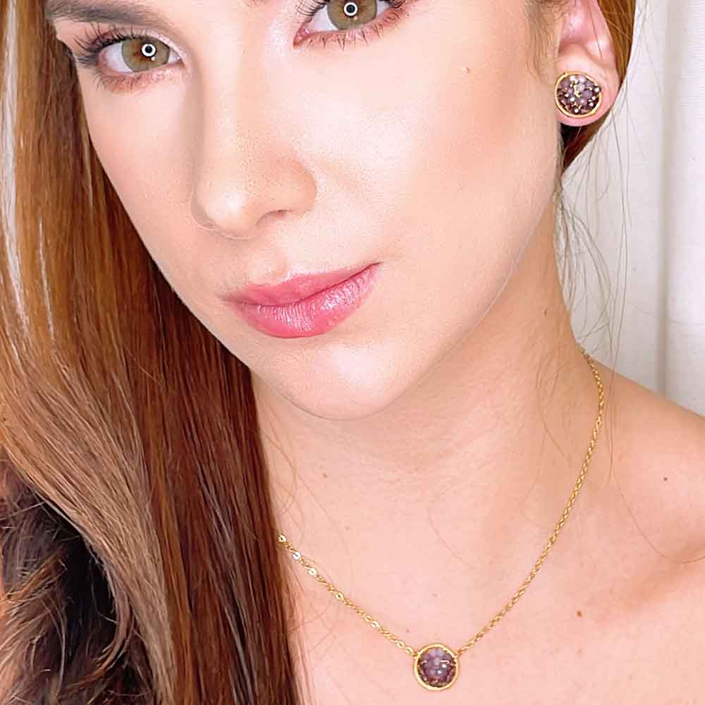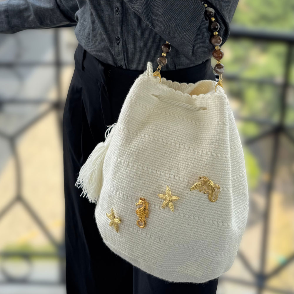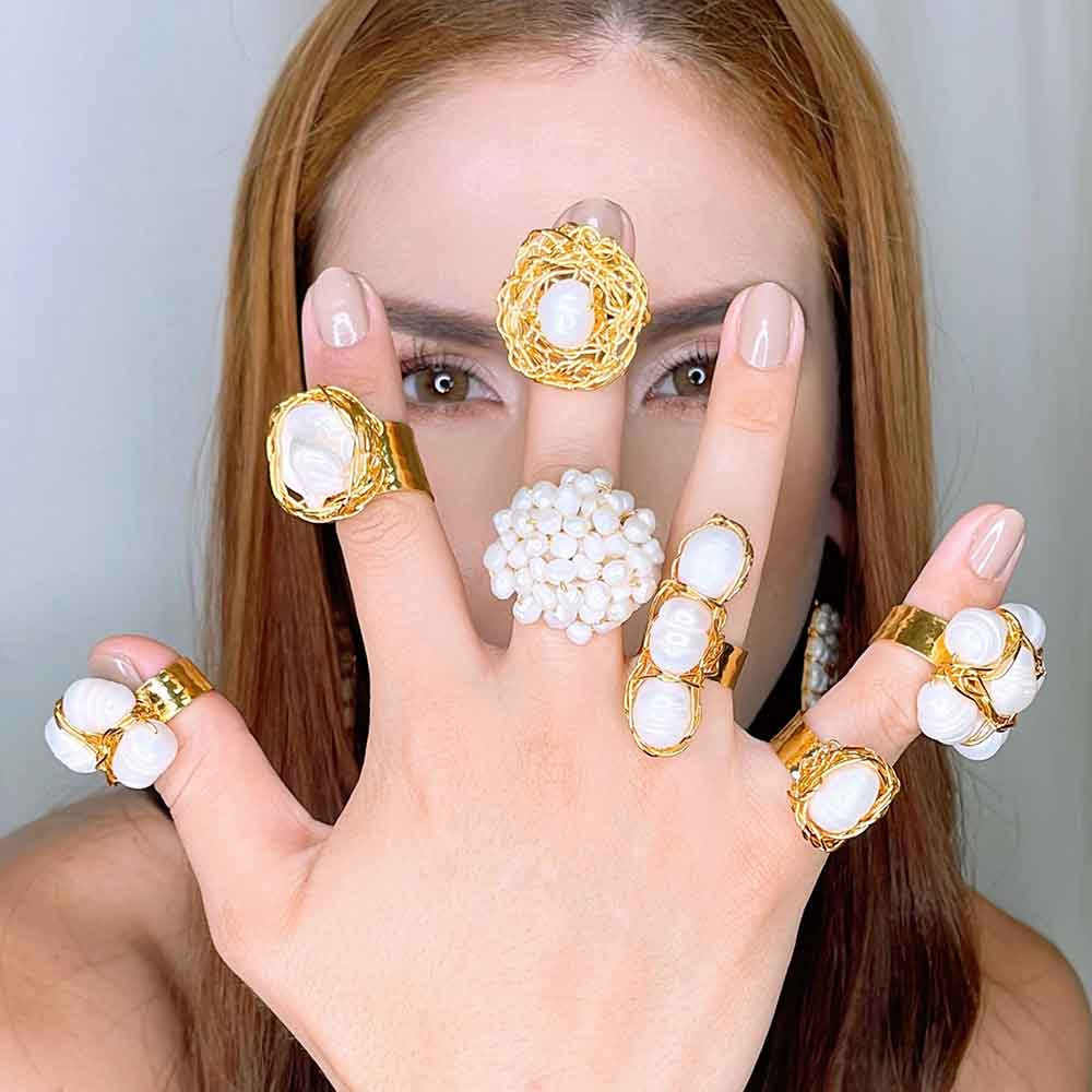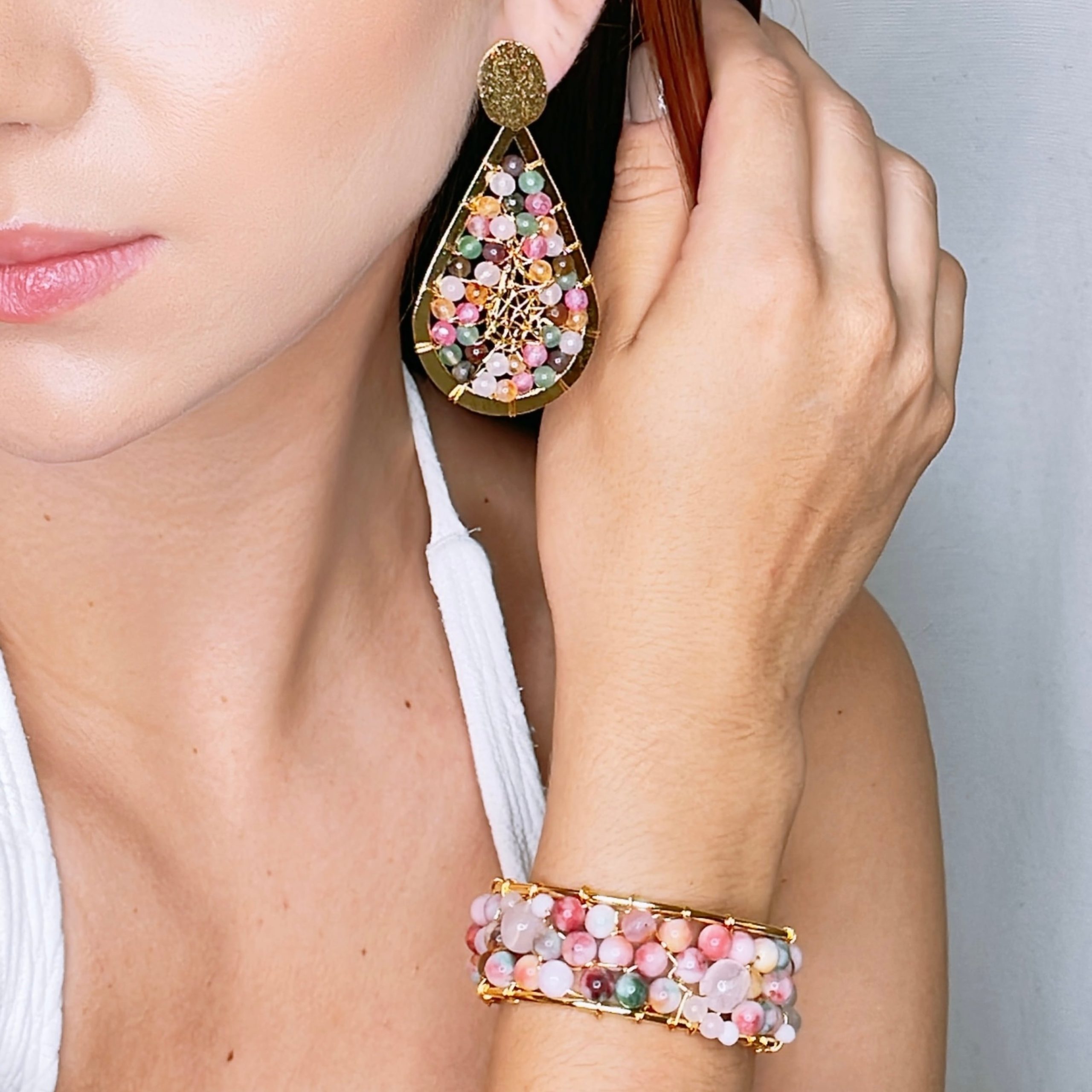 Tenemos artesanalmente hilos de bronce bañados en Oro de 24K formando mallas, como símbolo de que todos los caminos se conectan, mezclandolos con piedras semipreciosas, perlas y cristales.