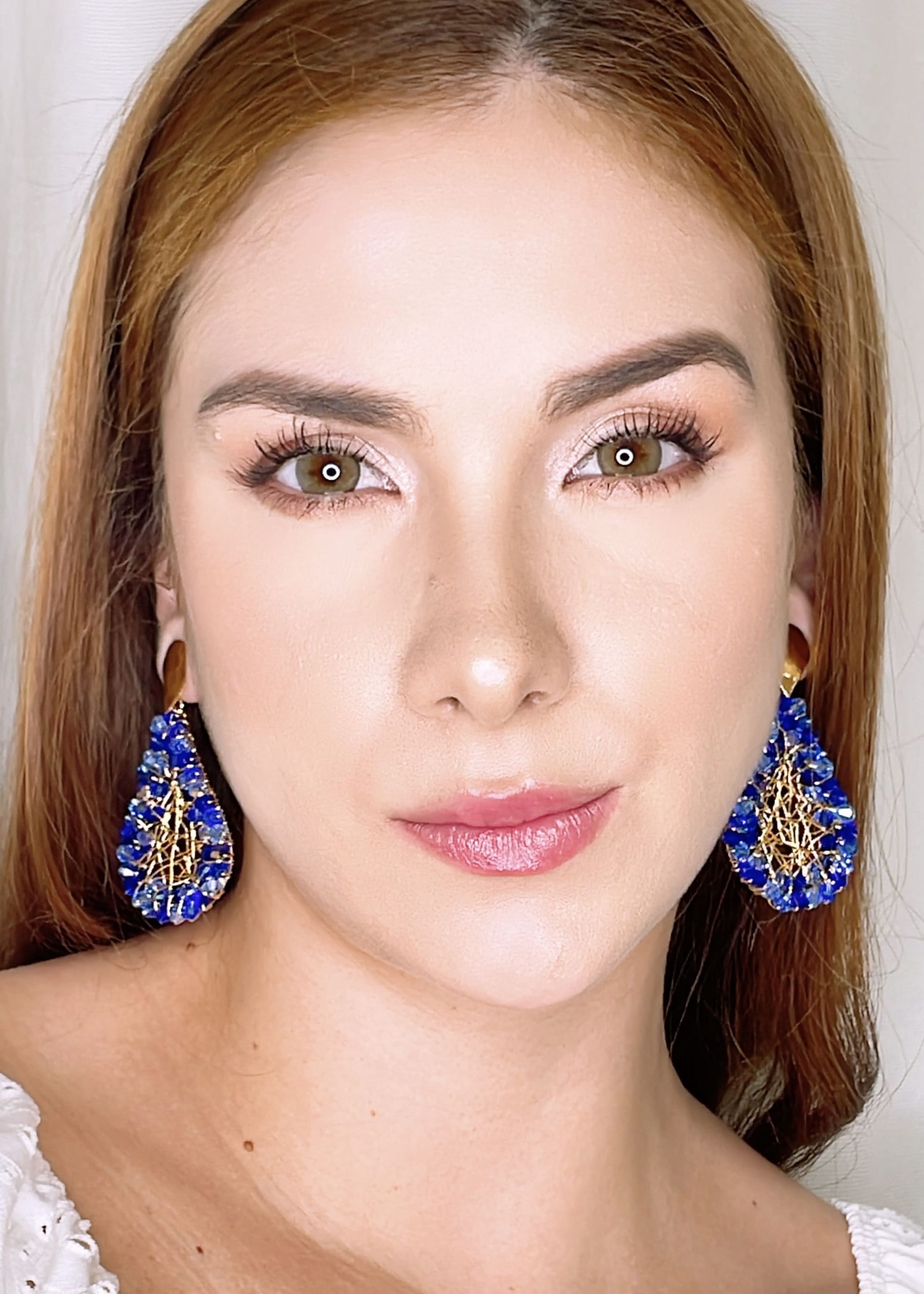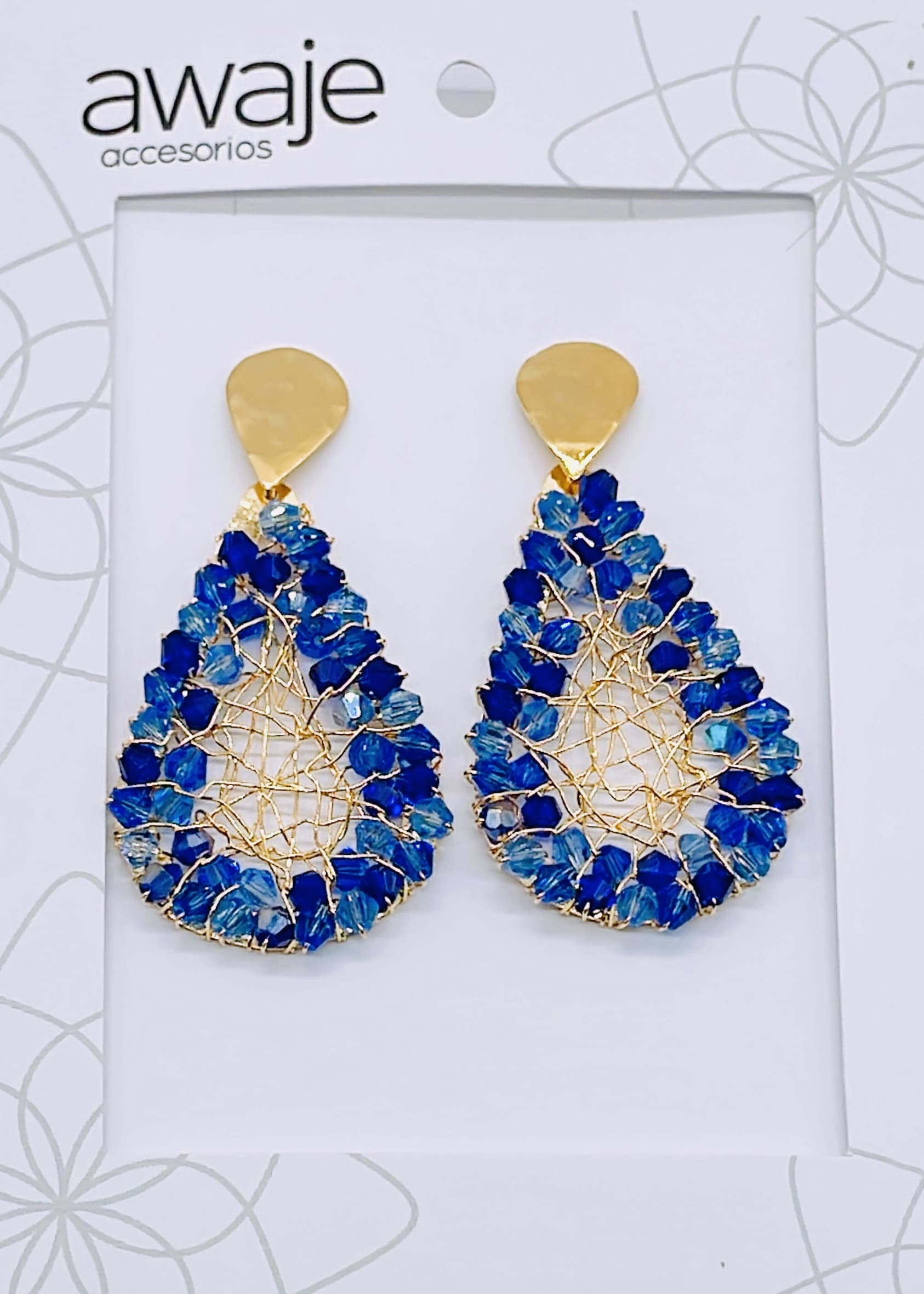 Earrings embroidered in wire mesh Teardrop 4,5 cm of blue crystals, 24K gold plated.