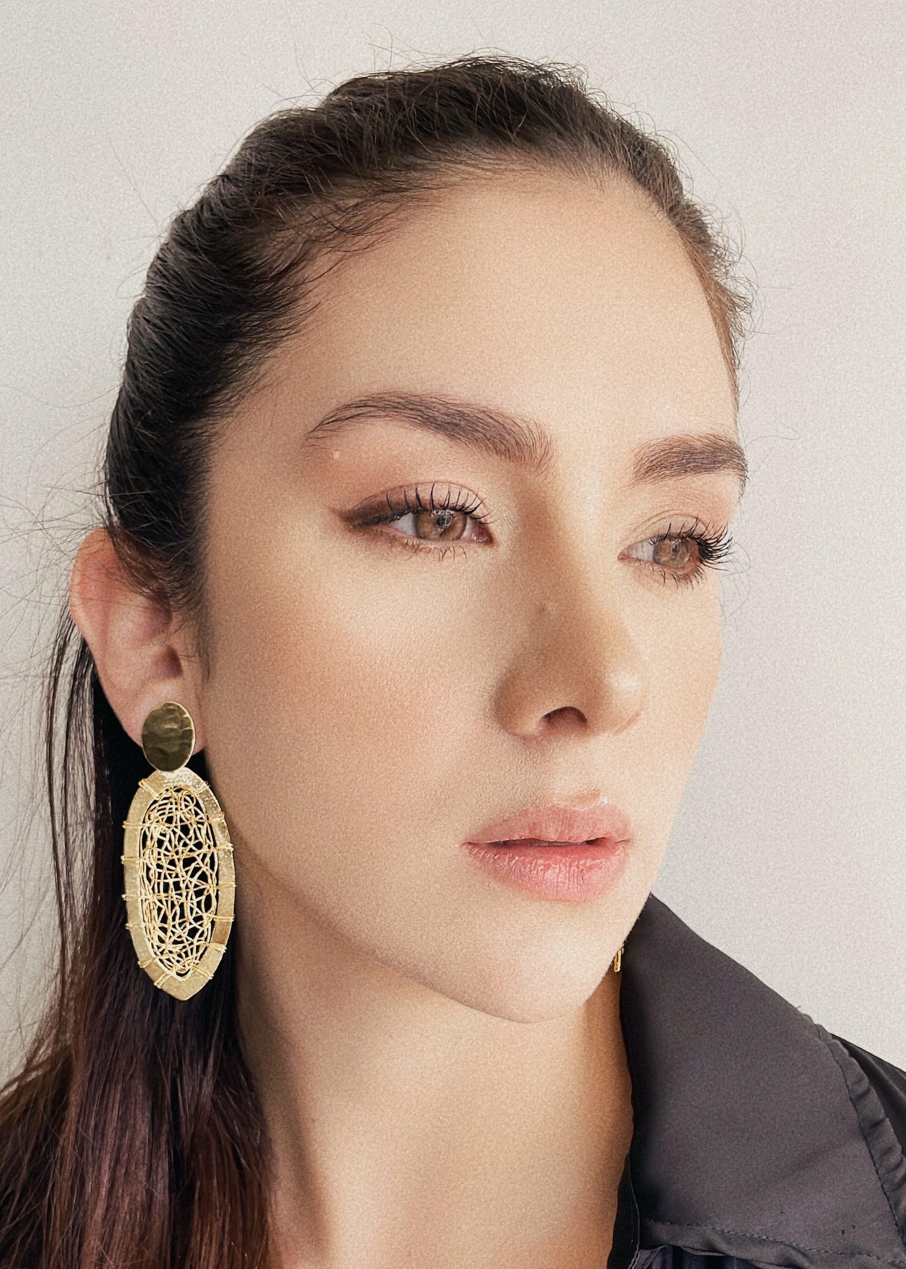 Arete bordado en alambrismo Ovalo de 6 cm Dorado, con baño en oro de 24K