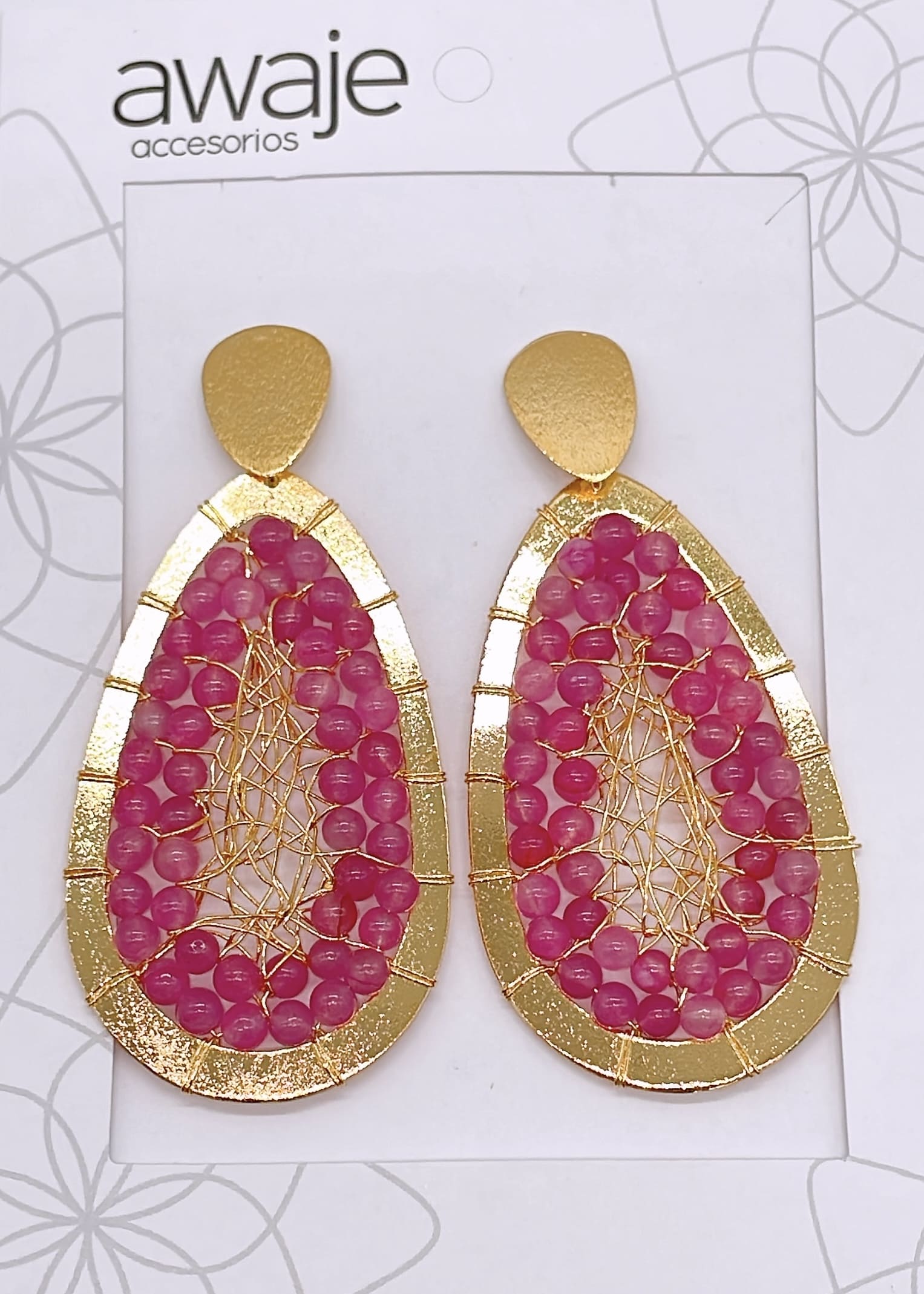 Fuchsia Agate Teardrop 6 cm wire embroidered earrings, 24K gold plated.