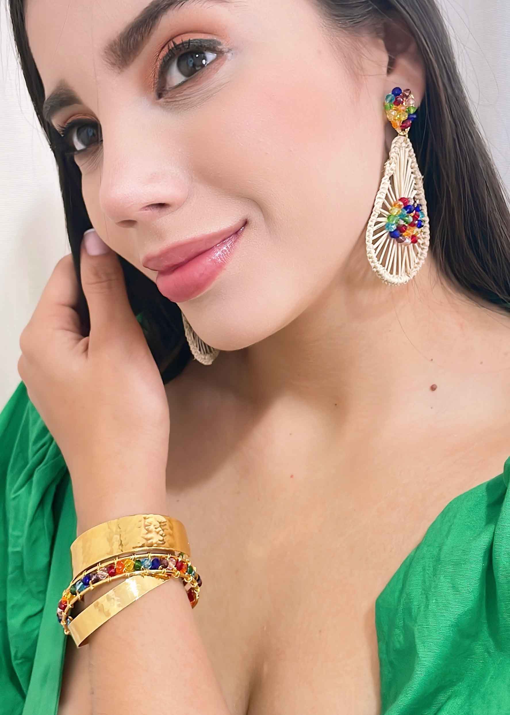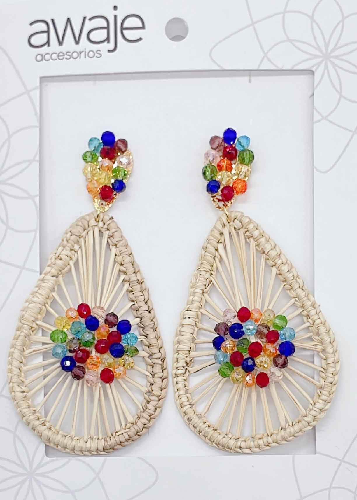 Arete tejido en rondelas de Cristal Multicolor y lagrima de iraca color Natural, Lagrima 7 cm ,topo con baño en oro de 24K