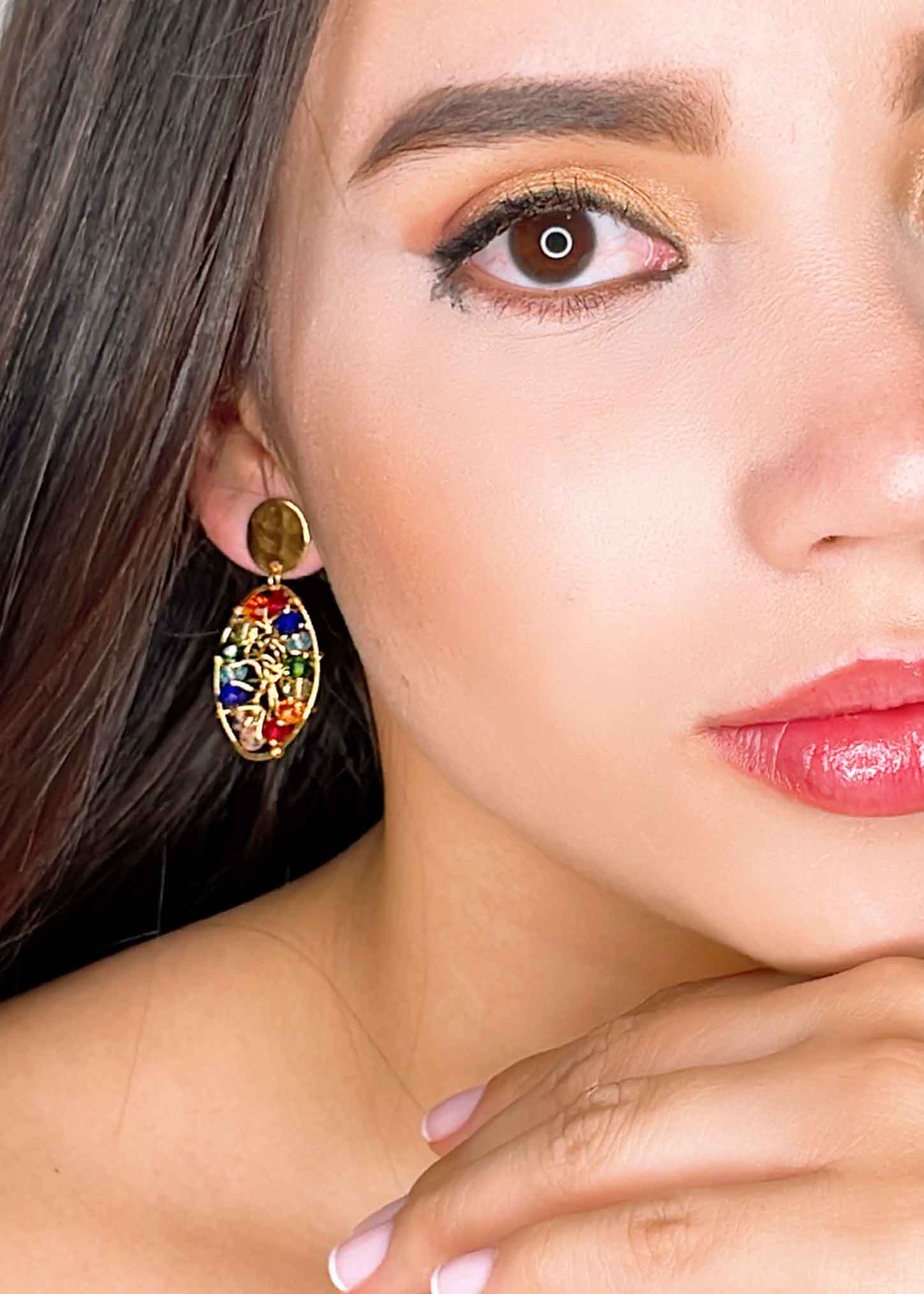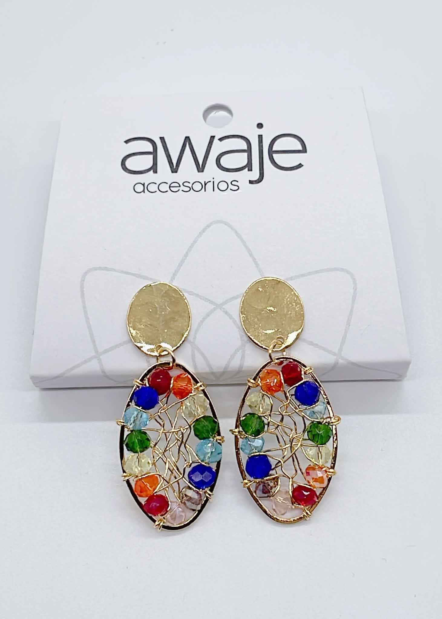 Arete bordado en alambrismo Ovalo 2,7 cm de Cristales Multicolor malla interna, con baño en oro de 24K