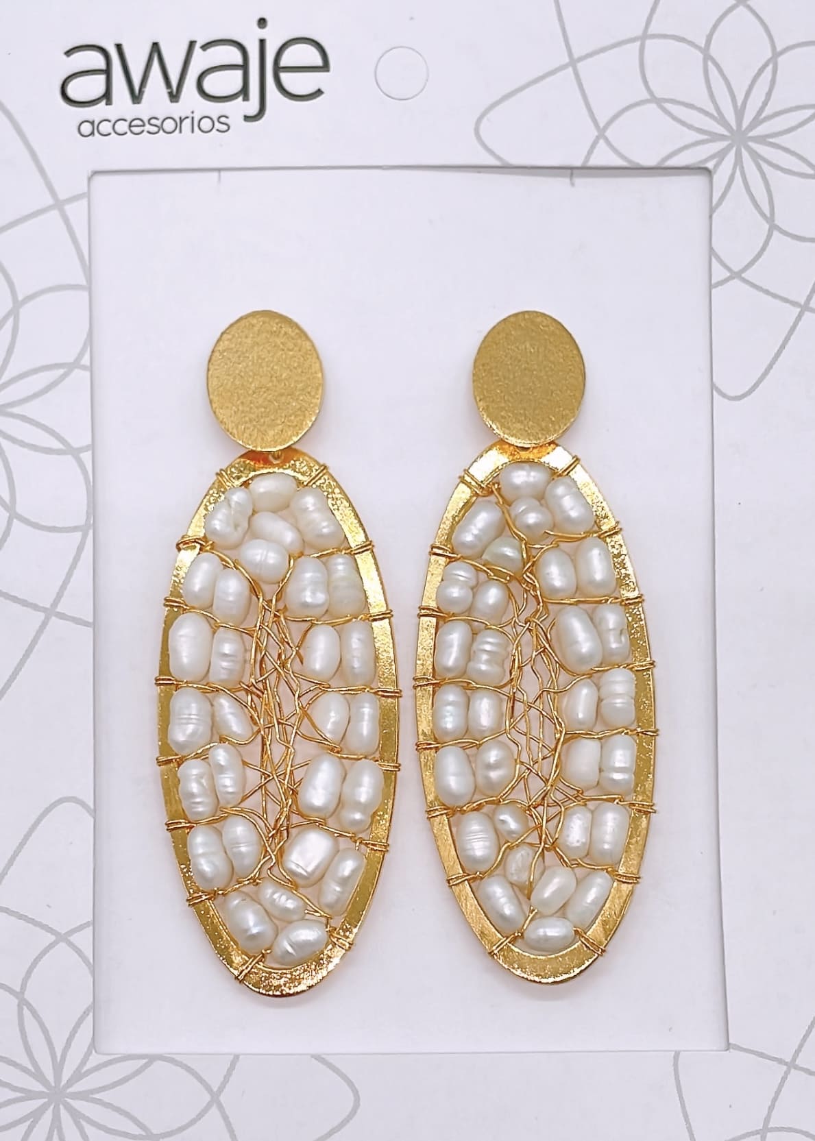 Earrings embroidered in wire wrapped 6 cm oval of freshwater pearls, 24K gold plated.