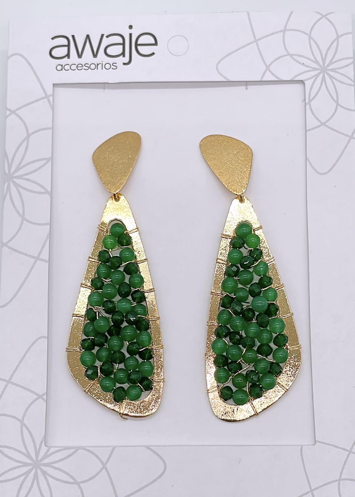 Earrings embroidered in wire mesh teardrop 6 cm of green agates, 24K gold plated.