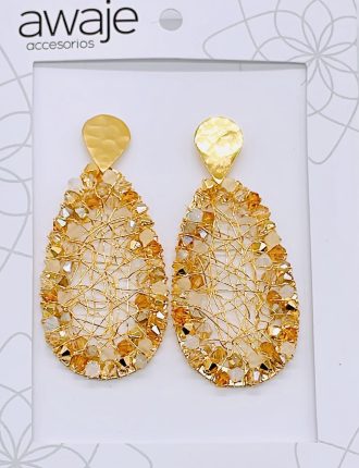 Arete y Dije Rombo de 2 cm con cadena de 40 cm de largo extencion de 5 cm,bordado en Alambrismo, Cristal Dorado, baño en oro de 24K