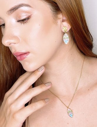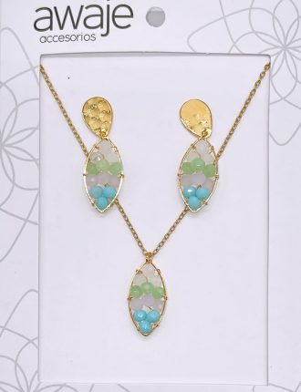 $75.000Arete y Dije Ovalo de 2 cm con cadena de 40 cm de largo extencion de 5 cm,bordado en Alambrismo, Cristales Pasteles, baño en oro de 24K -