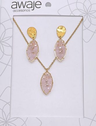 $75.000Arete y Dije Ovalo de 2 cm con cadena de 40 cm de largo extencion de 5 cm,bordado en Alambrismo, Cristal Rosado, baño en oro de 24K